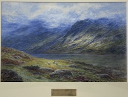 The hill mist turns the soft hues of the Westmoreland hills to subtle blues, luminous patches of sunlight break through to illuminate the lower slopes of the tarn with Sourmilk Gill waterfall, and the meticulously delicate rendering of the foliage heightened by the rich English sunlight that bathes the scene and the flock of sheep in the foreground. |