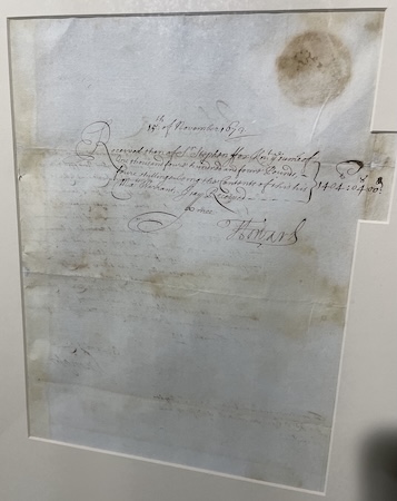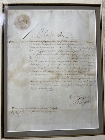 The verso being receipted by Howard. Accompanied by two engraved portraits of King Charles II following his restoration. One a fine seated portrait of the Monarch with a view of Windsor Castle in the background. London 1814, Mezzotint by Charles Turner.( 14 x 10 1/4") also a standing image of the King by Wale & Roberts with the Royal Arms & decorative border (11 3/4 x 7 1/2"). Bespoke Double French Line & wash panel, ragged mat, & fillet. UV. filter glazed on verso. bespoke black & gilt-wood & plaster frame by Edward Hayes, master framer.